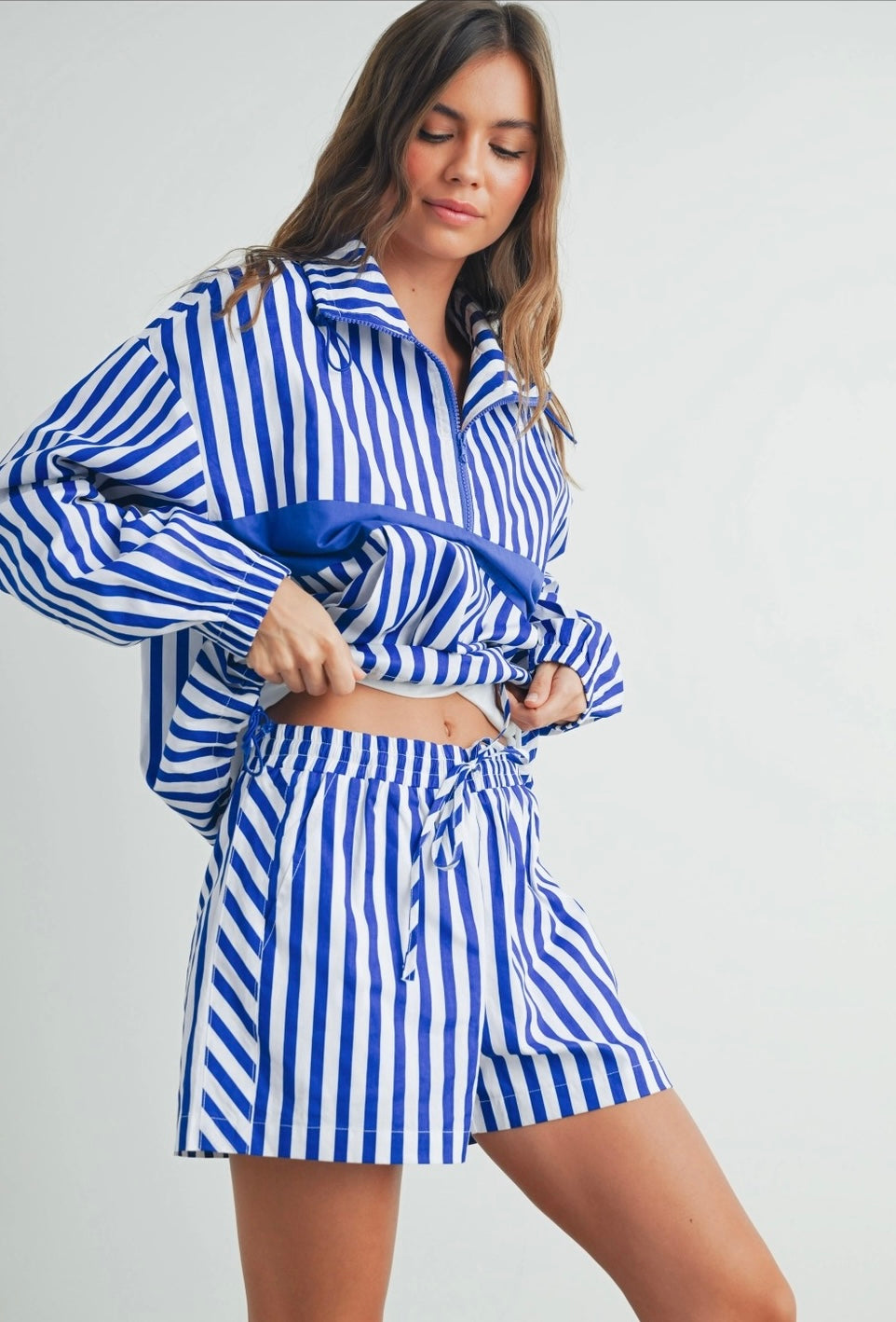 Meet the Messi Blue — your new favorite quarter-zip pullover with a fresh, athletic edge. Featuring bold white and blue stripes, a classic jersey-breaker feel, and a cinched waist for a flattering fit, this piece blends vintage vibes with modern streetwear style. The lightweight fabric makes it perfect for layering, while the quarter zip lets you wear it your way. Whether you're heading to the game or just channeling off-duty energy, Messi Blue brings the style — no effort needed.
