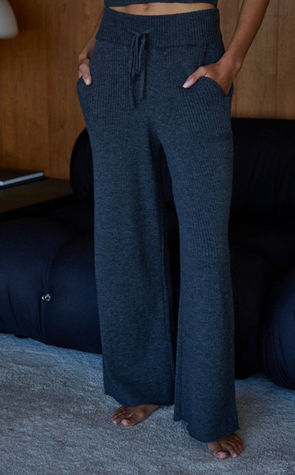 Wrap yourself in comfort with these dreamy heather gray knit pants — the ultimate cozy essential. Made from a soft, textured knit that feels like a warm hug, they feature a relaxed flared leg and a drawstring waist for the perfect adjustable fit. Whether you're lounging at home or stepping out in laid-back style, these pants deliver effortless comfort with a touch of flair. Cozy never looked so good.