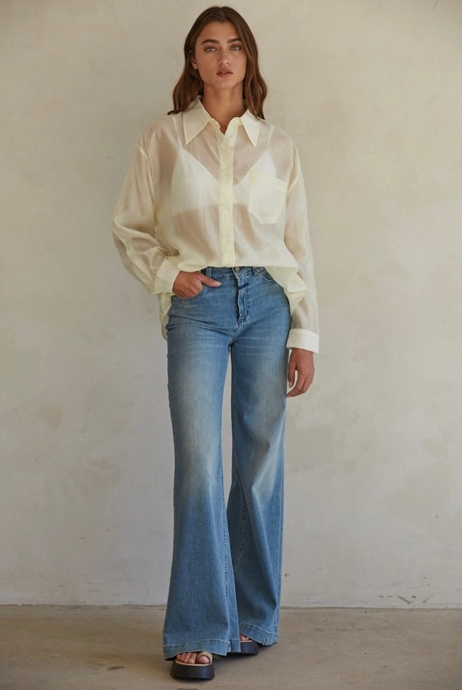 Inspired by the fast-paced finesse of fashion's most devoted assistant, The Emily is a sheer, long-sleeve button-up that commands attention without saying a word. Crafted from airy, see-through fabric, it layers beautifully over bralettes, camis, or even nothing at all — for those “I’m just one stomach flu away from my goal weight” kind of bold days. Tailored cuffs, a crisp collar, and a sleek silhouette bring structure to its delicate transparency, making it the ultimate power piece for boardrooms or after-hours.